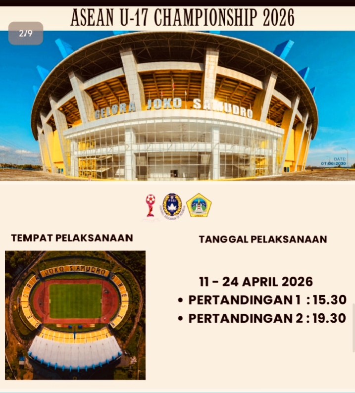Gresik, siliwangipost1.com – Kabupaten Gresik resmi ditunjuk sebagai tuan rumah ajang bergengsi ASEAN U-17 Championship 2026 yang akan digelar pada 11 hingga 24 April 2026. Seluruh pertandingan akan dipusatkan di Stadion Gelora Joko Samudro.