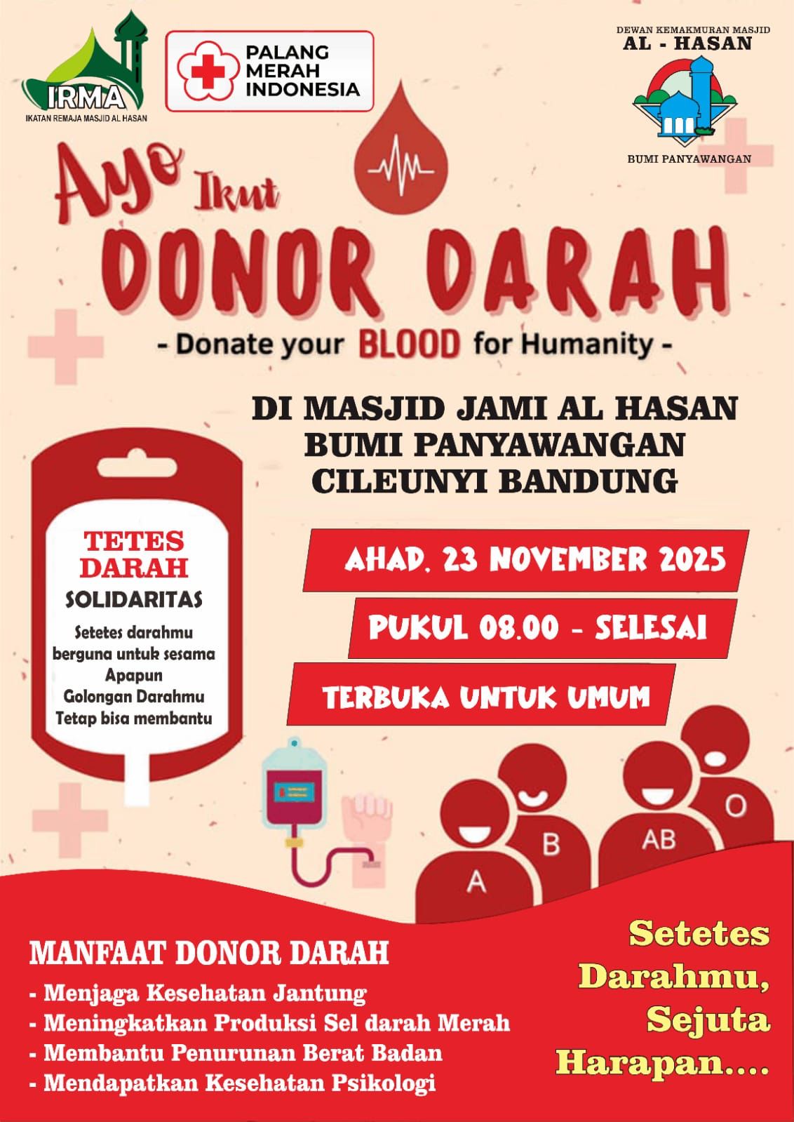 Kab.Bandung, Silpost — Aksi kemanusiaan donor darah akan digelar oleh Ikatan Remaja Masjid (IRMA) Al Hasan dengan bekerja sama dengan Palang Merah Indonesia (PMI) dan DKM Al Hasan, di Masjid Jami Al Hasan, Bumi Panyawangan, Cileunyi, Bandung, pada Ahad, (23 November 2025) mulai pukul 08.00 WIB hingga selesai.