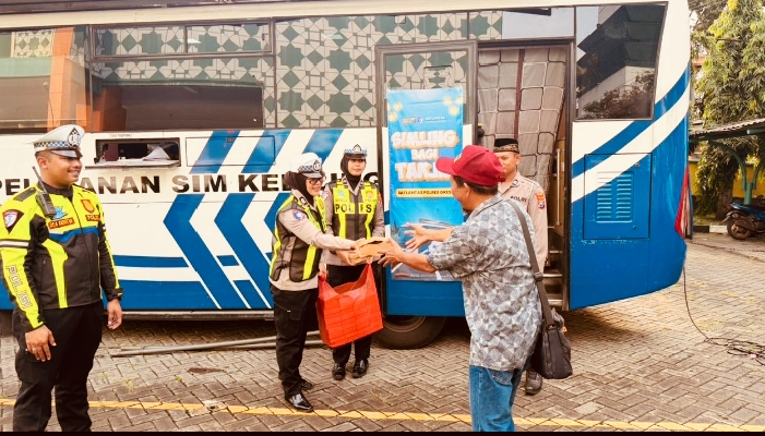 Tak hanya menghadirkan layanan administrasi, personel Satlantas Polres Gresik juga membagikan paket takjil gratis kepada para pemohon SIM serta pengendara yang melintas di sekitar area masjid.