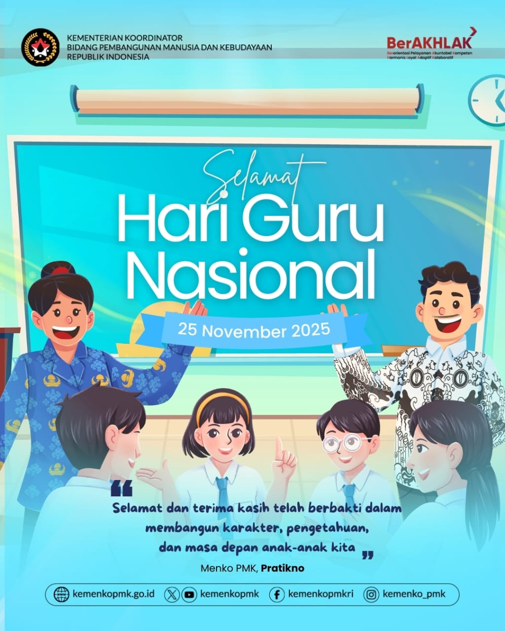 “Pengabdian, keteladanan dan kontribusi para guru merupakan pilar utama dalam menghadirkan pendidikan yang inklusif, berkualitas, dan berkeadilan,” demikian pernyataan resmi Pemerintah dalam rangka memperingati Hari Guru Nasional 2025.
