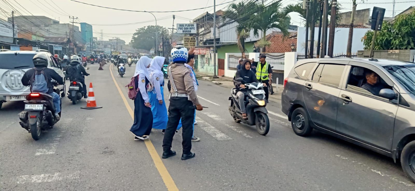 Personil Unit Lantas Polsek Cileunyi Sigap Bantu Seberangkan Siswa, Antisipasi Kecelakaan di Jam Masuk Sekolah
